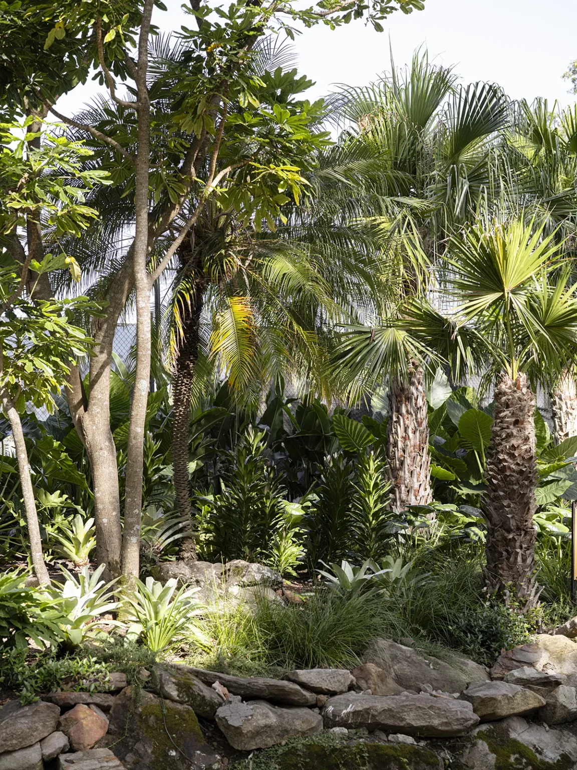 The elevated Tennis Pavilion was carefully woven into the landscape through layered, lush planting and structured landscaping that visually connects back to the driveway. Advanced palms framed the approach and bordering dense, tropical style plantings softened built elements and enhanced the sense of arrival.